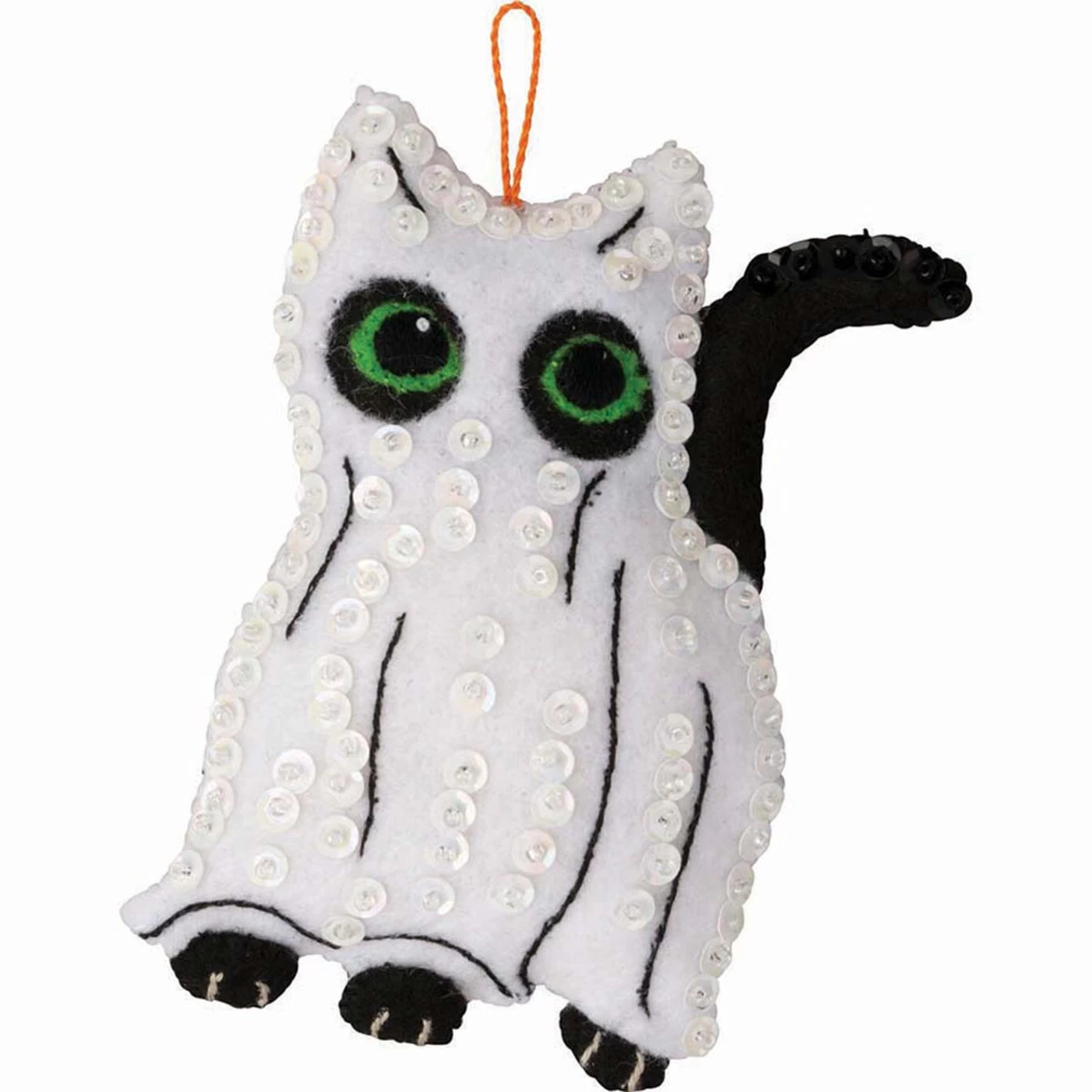These playfully spooky felt and sequin ornaments feature black cats dressed up for Halloween! Wearing classic costumes of a bat, ghost, witch, jack-o’-lantern, mummy, and a clown, these costumed kitties are ready for Halloween hijinks! The felt appliqué kit includes stamped felt, sequins, beads, cotton floss, needle, and instructions. Made in U.S.A.