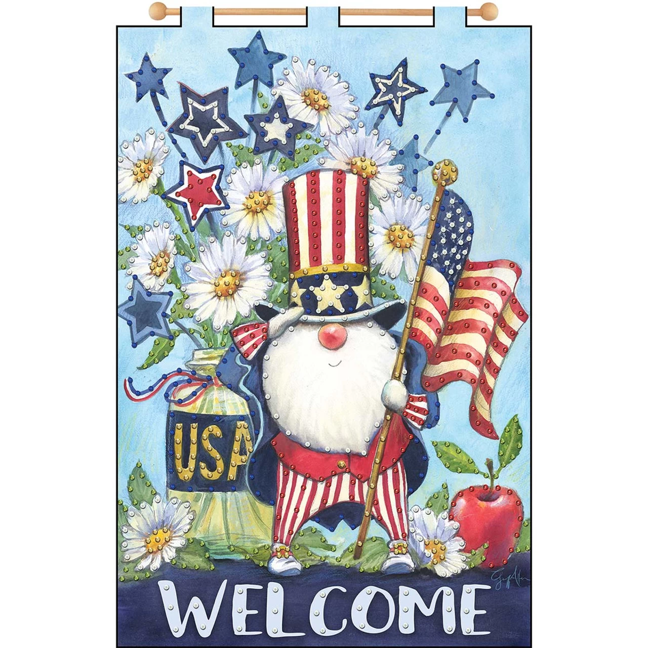 • The design features a welcome sign with a gnome dressed as Uncle Sam holding an American flag and a bouquet of white daisies and blue stars.