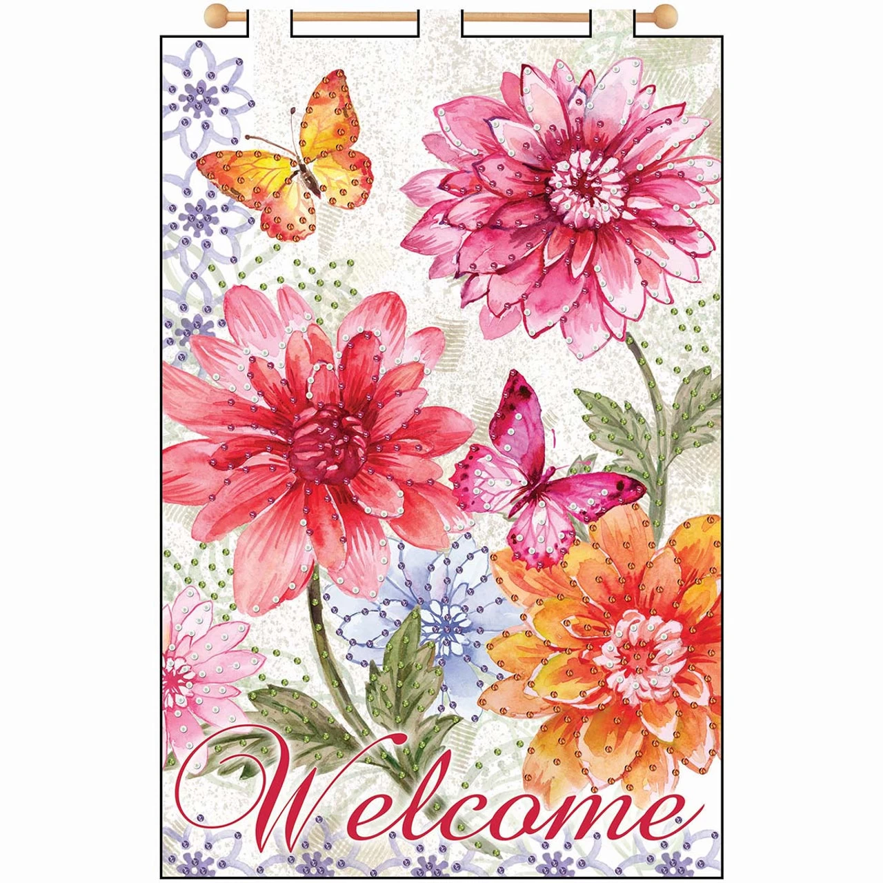 • The design features a welcome sign with orange and pink butterflies flying around flowers in vibrant shades of pink, orange, red, and purple.