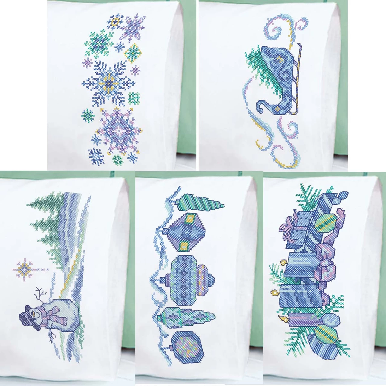 Enjoy the soothing shades of Christmas blues for your bedroom holiday décor. Stamped for cross-stitch on pre-finished white polyester/cotton percale fabric pillowcases. 20 x 30″ (51 x 76cm). Imported.