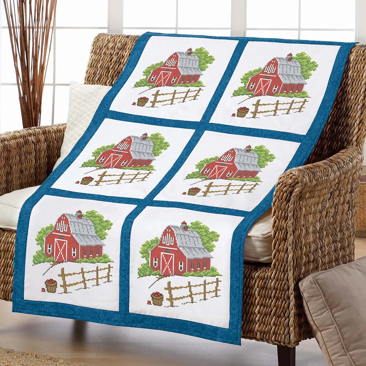 This farmhouse quilt block design features a big red barn in a country farm scene filled with leafy green bushes and trees with a wooden fence and a bushel of apples. The designs are stamped for cross-stitch on white cotton/polyester fabric. Simply follow the easy-to-read chart and instructions to stitch the designs. The completed quilt blocks can be finished as a quilt but also are perfectly sized to make throw pillows. Floss, needle, and finishing fabrics are not included. Each quilt block measures 18 x 18″ (46 x 46cm). Imported.