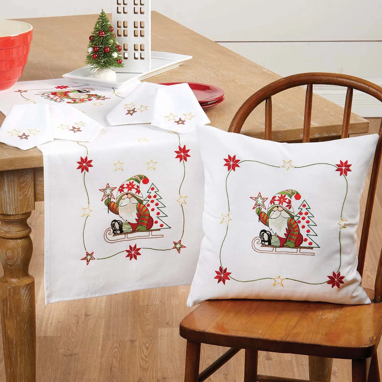 • These Christmas linens are ready for stitching with a gnome holding a red and green star sitting on a wooden sled with a Christmas tree framed by a green border with poinsettias and gold star embellishments.