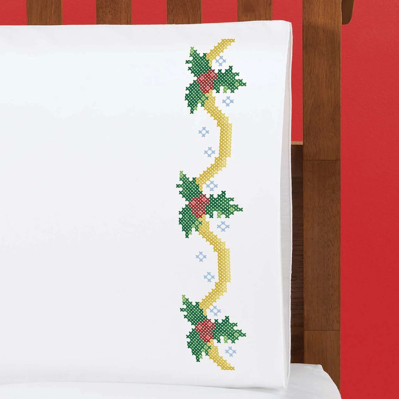 These cross-stitch pillowcases feature boughs of holly displayed on a golden ribbon surrounded by little snowflakes. The festive holiday design is perfect for bringing the Christmas spirit to your guest room to welcome holiday guests! The design is stamped for cross-stitch on white cotton/polyester pillowcases with a hemmed edge. There are 2 pillowcases in the set, and each pillowcase is pre-finished and ready for stitching. Simply follow the easy-to-read chart and instructions to stitch the pillowcases. Floss and needle are not included. Each pillowcase is standard/queen size measuring 20 x 30″ (51 x 76cm). Imported.