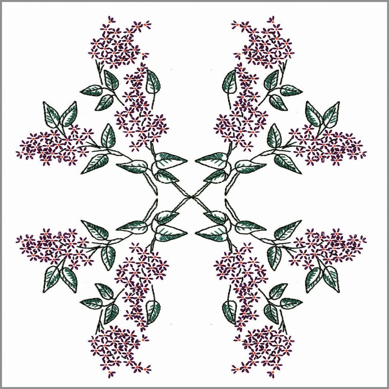 • These quilt blocks are ready for stitching with a geometric arrangement of dark green leaves and little violet blossoms.