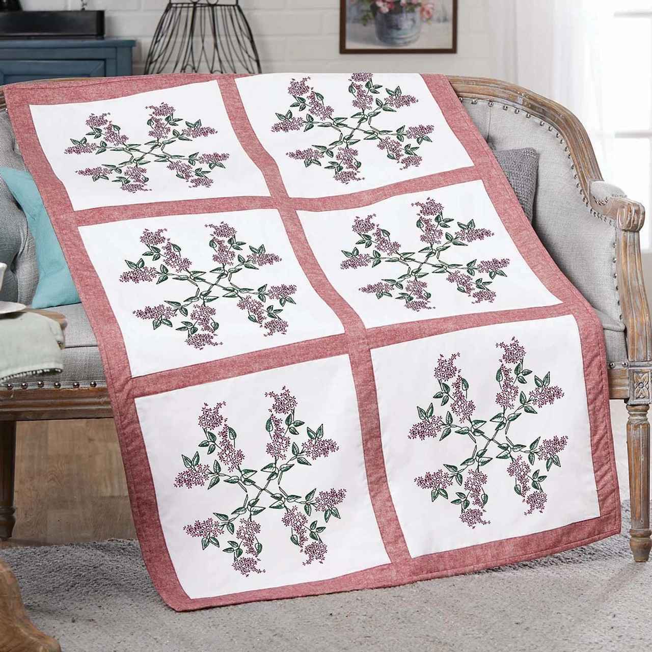 This floral quilt block design features a display of little purple flowers and dark green leaves arranged in a geometric pattern. The designs are stamped for embroidery on white cotton/polyester fabric. Simply follow the easy-to-read chart and instructions to stitch the designs. The completed quilt blocks can be finished as a quilt but also are perfectly sized to make throw pillows. Floss, needle, and finishing fabrics are not included. Each quilt block measures 18 x 18″ (46 x 46cm). Imported.