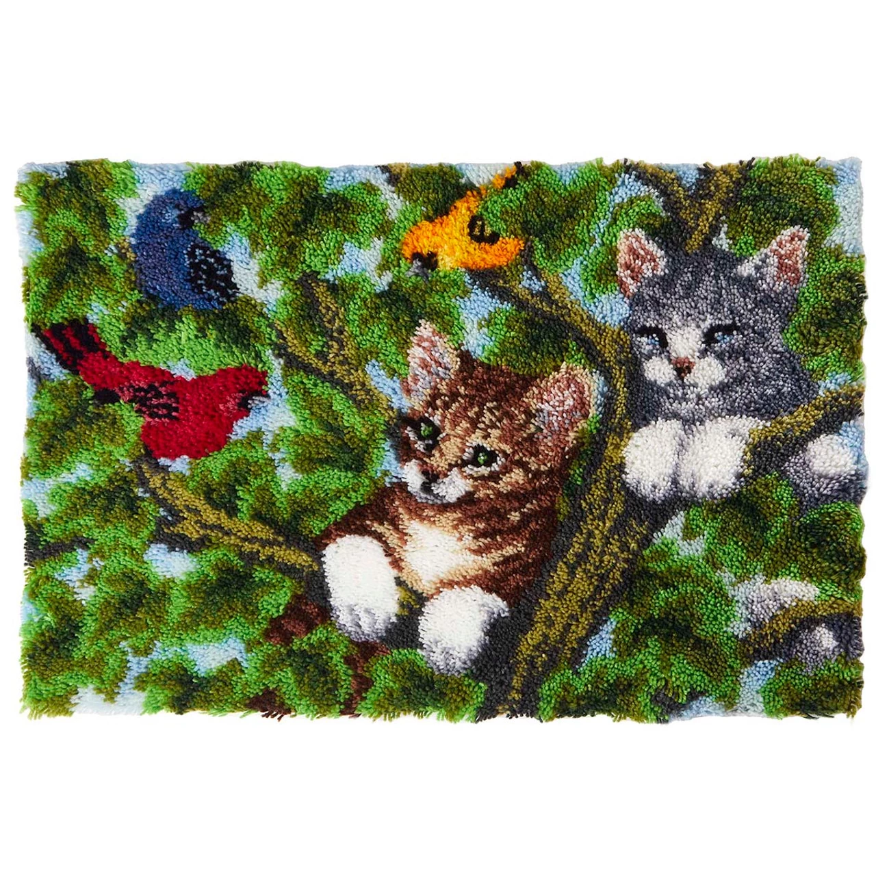 This play latch hook design features a pair of mischievous kittens who have taken birdwatching to a new level by climbing high up into a tree! The daring duo is sitting on branches next to the trunk as they watch a cardinal, indigo bunding, and goldfinch perched in the branches surrounded by a canopy of green leaves. The bright and cheery scene is perfect for summer decorating. The finished project can be made into pillows, wall hangings, rugs, and more. Kit includes 3.75-mesh gridded canvas, lofty pre-cut 100% acrylic yarn, clear vinyl storage bag, easy-to-follow chart, and instructions. Latch hook tool, rug binding, and non-slip backing not included. The higher-gauge canvas of this project allows for a high level of detail in the finished design. 40 x 27″ (102 x 69cm). Imported.