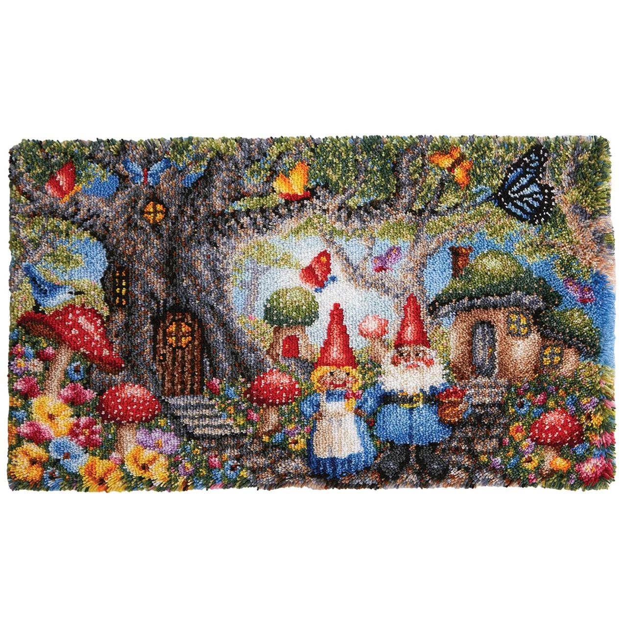 Enter a land of whimsy as you assemble this highly detailed garden scene showing a gnome couple standing outside their treehouse home. The surrounding fairy houses, butterflies, flowers, and mushrooms bring a magical touch to this enchanting latch hook scene. The finished project can be made into pillows, wall hangings, rugs, and more. Kit includes 3.75-mesh gridded canvas, lofty pre-cut 100% acrylic yarn, clear vinyl storage bag, easy-to-follow chart, and instructions. Latch hook tool, rug binding, and non-slip backing not included. The higher-gauge canvas of this project allows for a high level of detail in the finished design. 50 x 30″ (127 x 76cm). Imported.