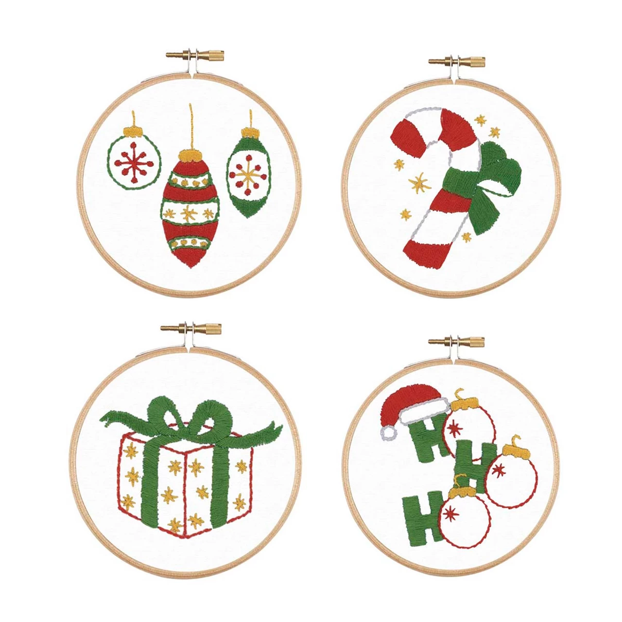 These merry ornaments in festive colors will make decorating during the season even more jolly. Stamped for embroidery on white polyester/cotton fabric. Kit includes cotton floss, wooden hoops, and needle. Set of four. 4″ (10.2cm) dia. Made in U.S.A.