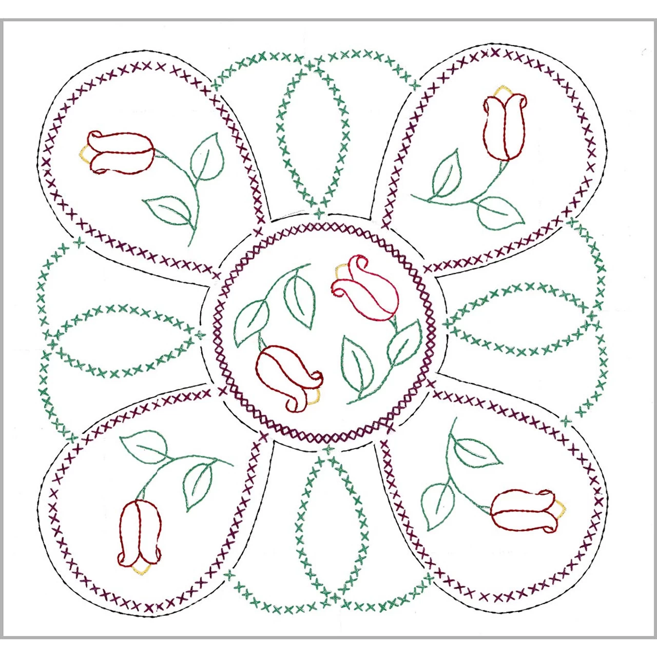 Beautify and geometry meet in this striking floral arrangement. Create modern-day heirloom needlework with Revival, a collection of vintage designs preserved from the needlework archive and given new life for today’s stitchers. Stamped for cross-stitch or embroidery on white cotton/polyester fabric. Set includes six 18 × 18″ (46 x 46cm) quilt blocks. Imported.