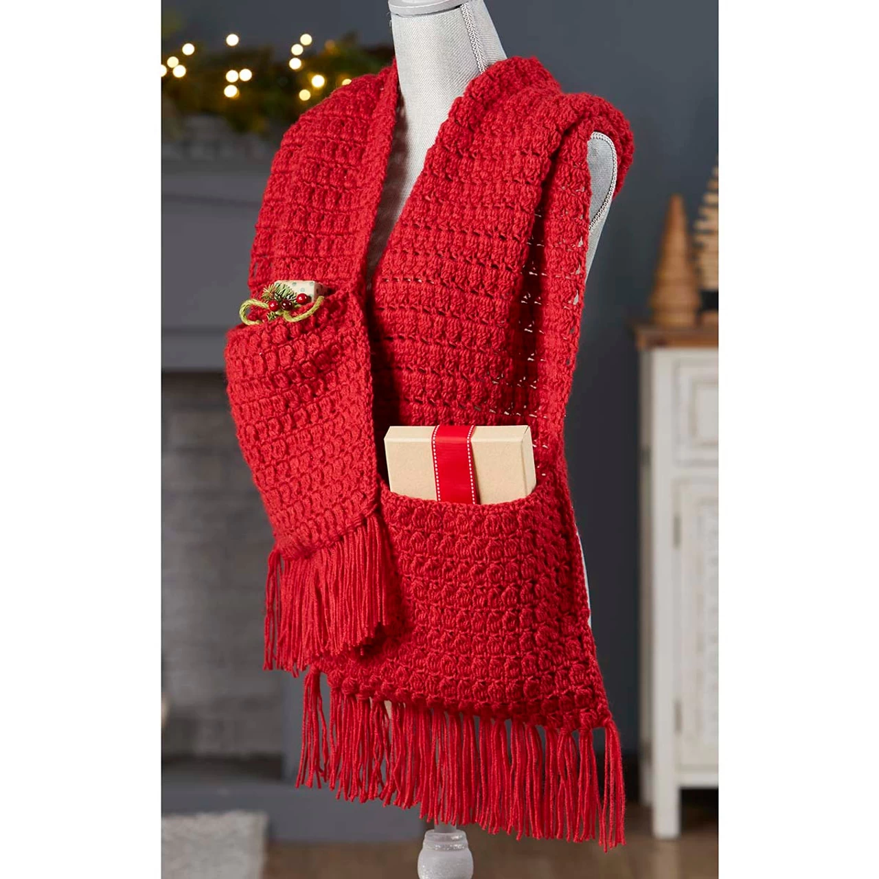 You’ll merrily show o¬ff the pockets in this cozy shawl. Stitched in bright red Herrschners Worsted 8 yarn, this textured shawl is great for the Christmas season, or any time of year you want to feel extra cozy! The oversized pockets are perfect for keeping your hands warm or stashing your phone, a book, or more! This crochet kit includes the yarn and easy crochet instructions. The finished shawl measures 12 x 60″ (30 x 152cm). Requires a US size I-9 (5.5mm) hook to complete (not included). Imported.
