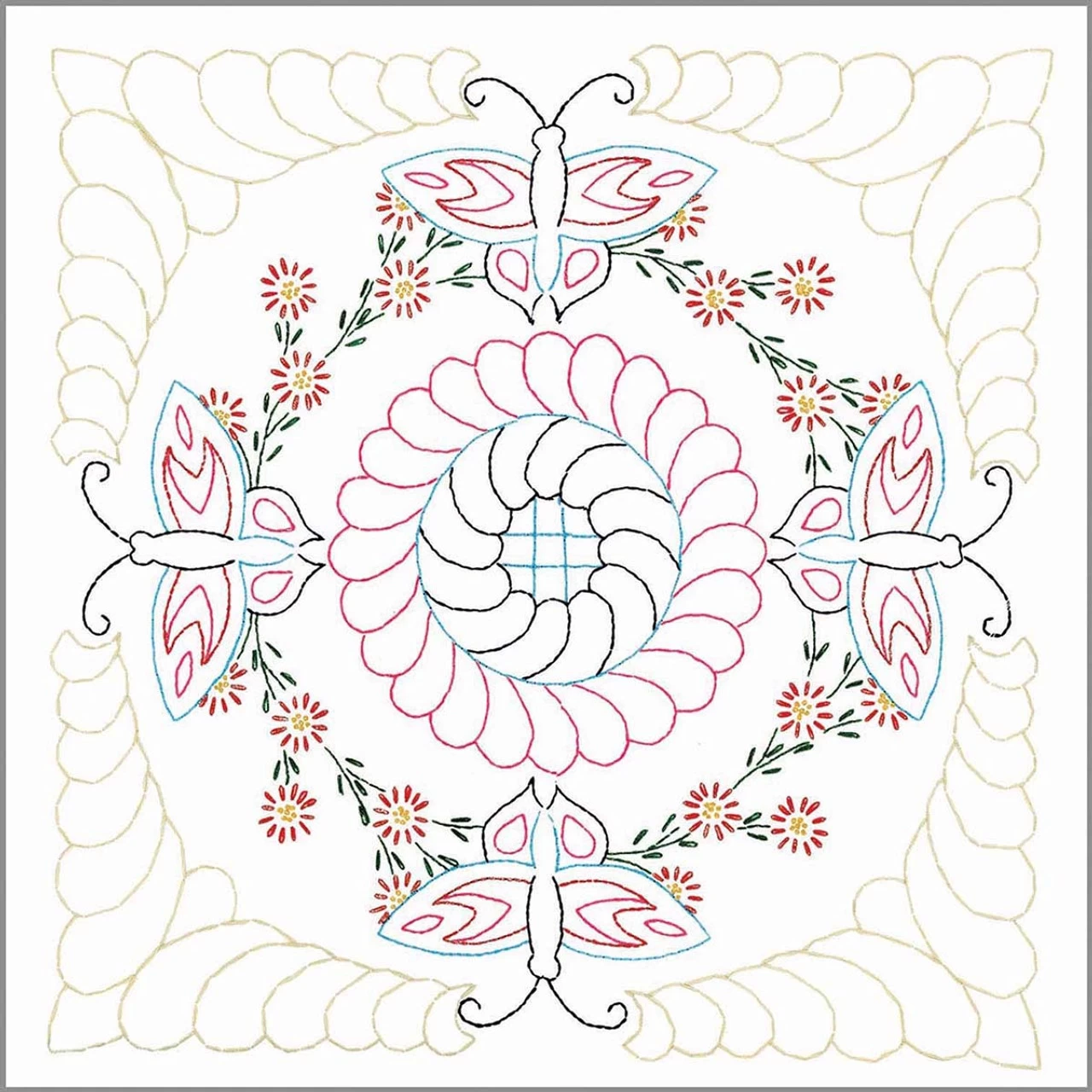 This floral quilt block design features a geometric display of butterflies, blossoms, and swirling stitches that create a frame around the beautiful design. The designs are stamped for embroidery on white cotton/polyester fabric. Simply follow the easy-to-read chart and instructions to stitch the designs. The completed quilt blocks can be finished as a quilt but also are perfectly sized to make throw pillows. Floss, needle, and finishing fabrics are not included. Each quilt block measures 18 x 18″ (46 x 46cm). Imported.