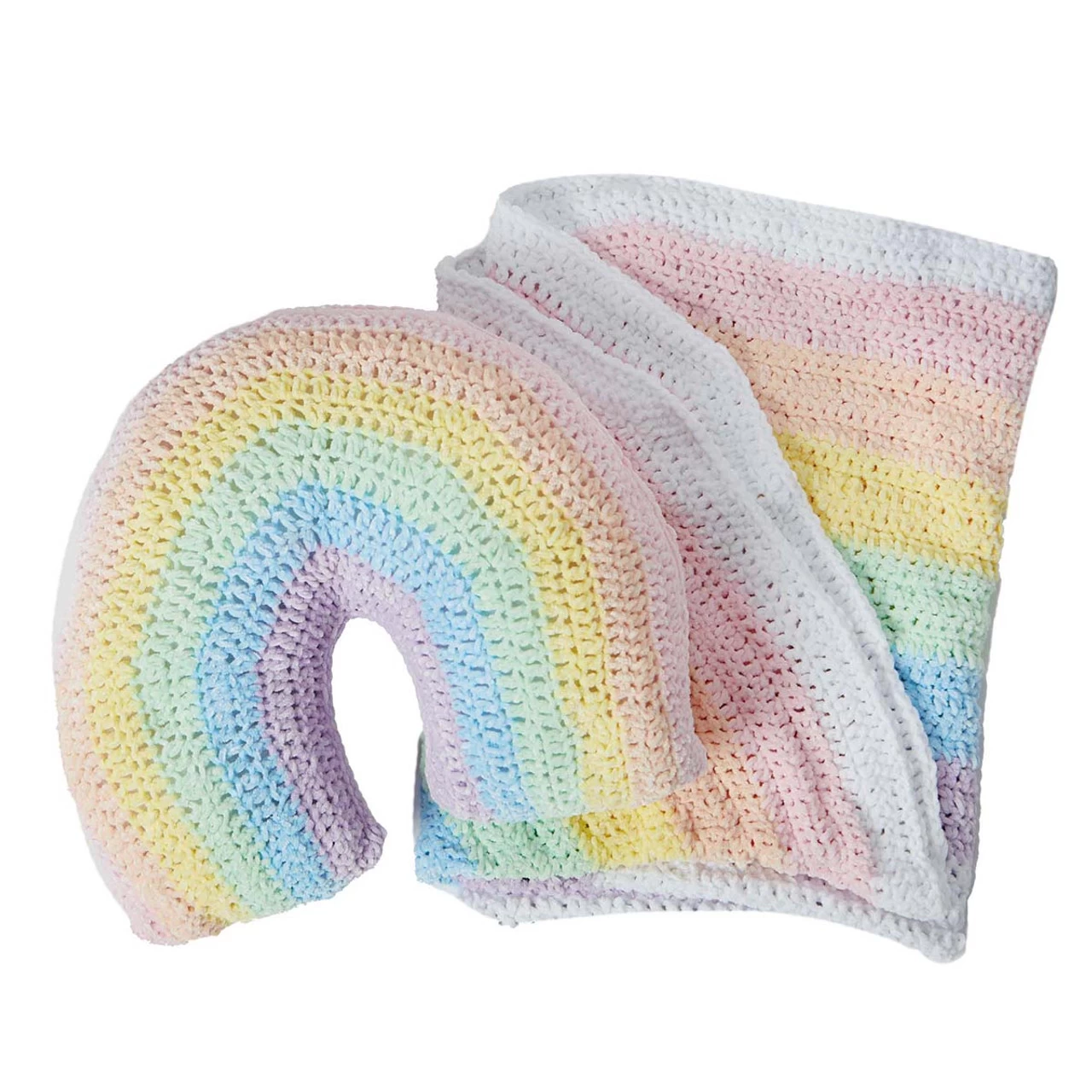 Naptime is cozy and colorful with this super-snuggly pair that includes an arched rainbow pillow and a matching shaped baby blanket! Stitched in the wonderfully soft Herrschners Baby Velvet yarn, this pair of pastel rainbows brightens up baby’s nursey! Along with the yarn and easy crochet instructions, this baby blanket kit comes with a clear zippered storage bag, yarn needle, and a label for personalization.