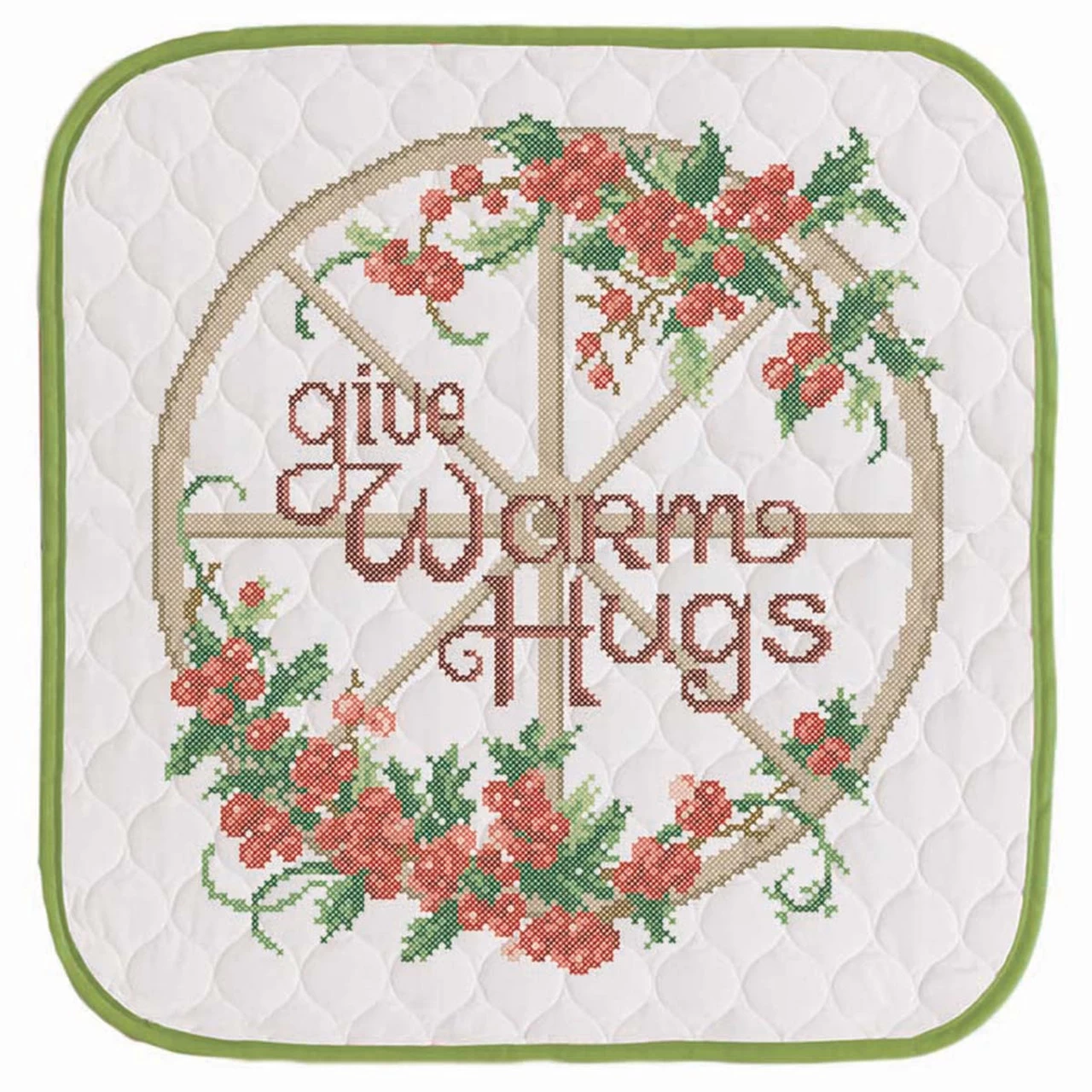 Nothing beats a big hug! This beautiful wall hanging serves as a heartwarming reminder to embrace a warm, loving spirit with the phrase “give warm hugs,” a sweet sentiment for any time of the year. The elegant typography is displayed over a wagon wheel adorned with beautiful red flowers, creating a wreath-like display for your wall. This fun and easy design is stamped for cross-stitch on pre-quilted white polyester/cotton fabric with an olive green binding. No sewing skills or quilting experience is needed to finish your wall hanging. Simply cross-stitch the design following the easy-to-read chart and instructions, and your wall hanging is ready to display! Floss and needle are not included. 30 × 30″ (76 x 76cm). Imported.