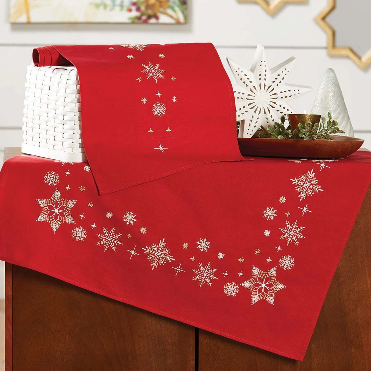• These pre-finished table topper and table runner are ready for stitching with a flurry of white and gold snowflakes with sparkling metallic accents.