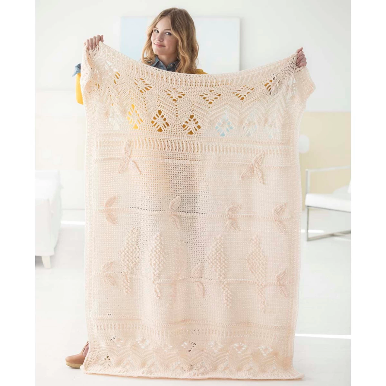 Embossed birds and lacy blooms are a delightful sign of spring on this chic design. Kit includes Lion Brand Vannaโs Choice yarn and intermediate crochet instructions. 44 ร 58″ (112 x 147cm). Imported.