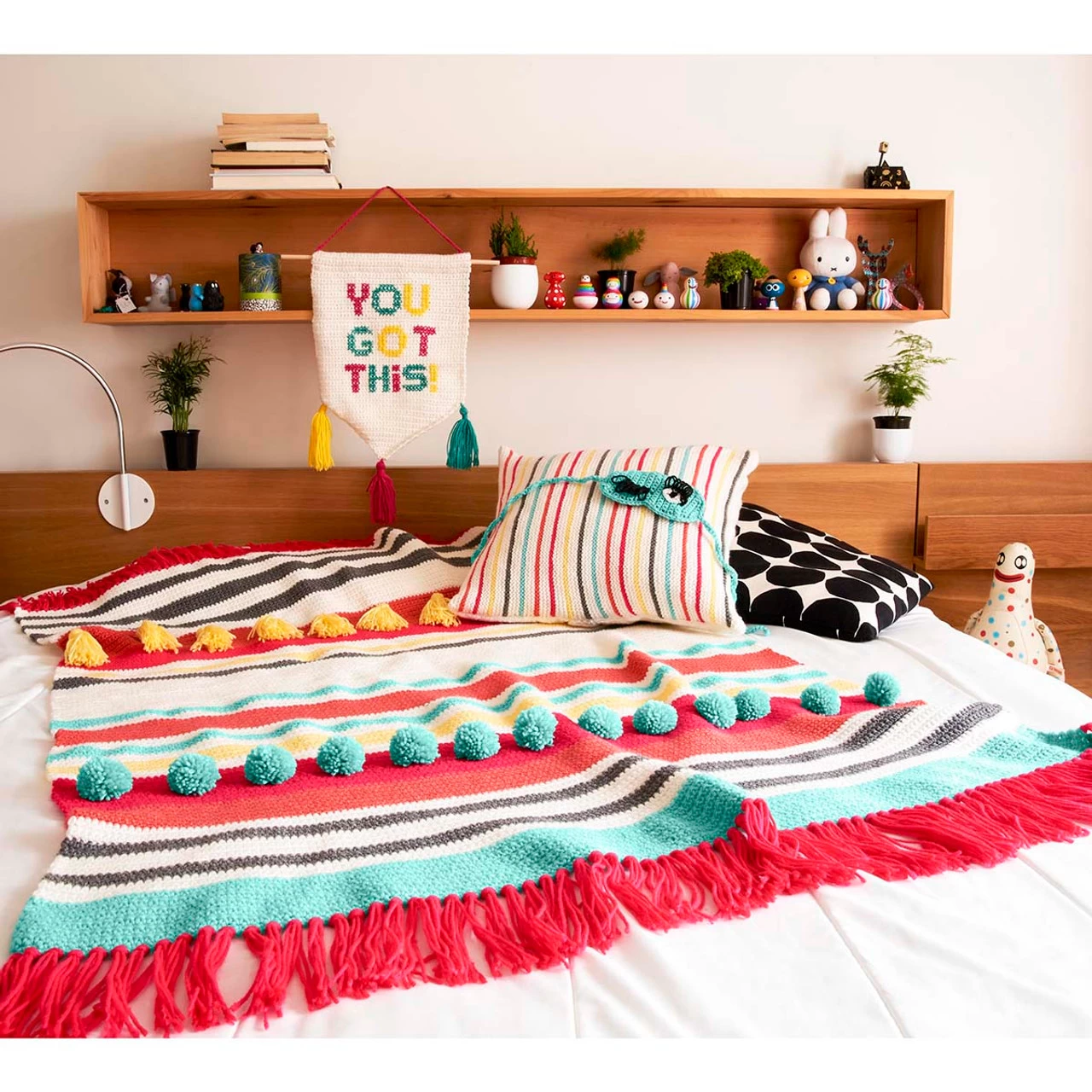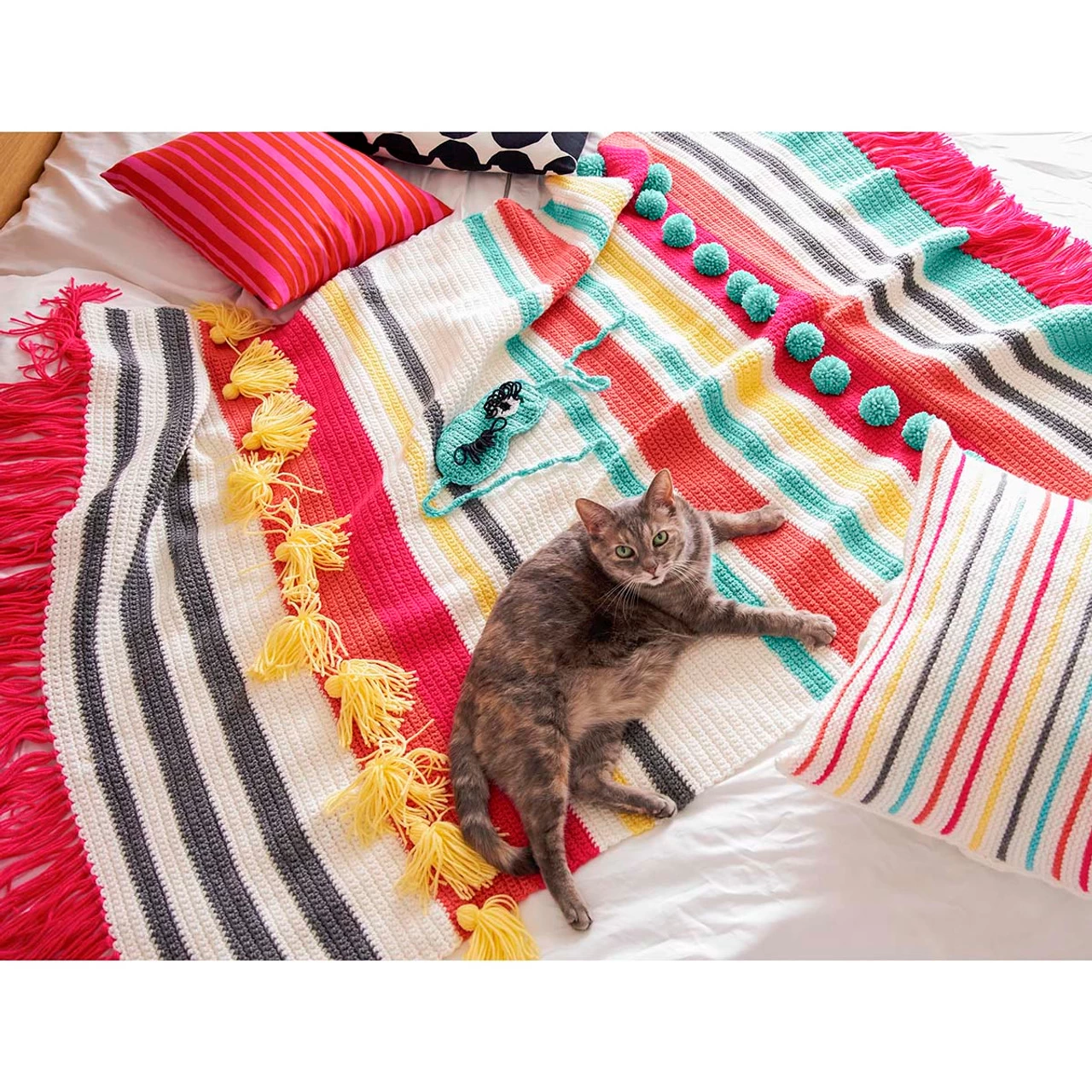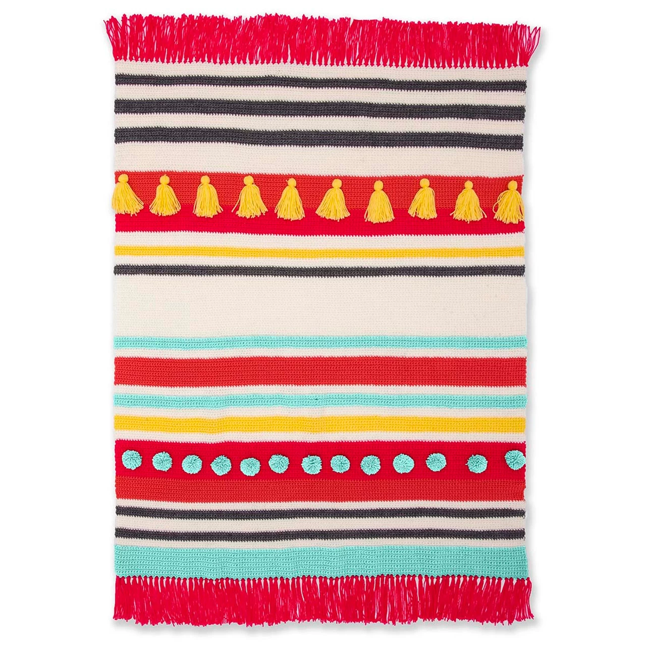 Tassels and pom-poms add fun, textural detail to the vibrant stripes of this bold afghan. Kit includes Red Heart Super Saver yarn and easy crochet instructions. 50 x 59″ (127 x 150cm). Imported.
