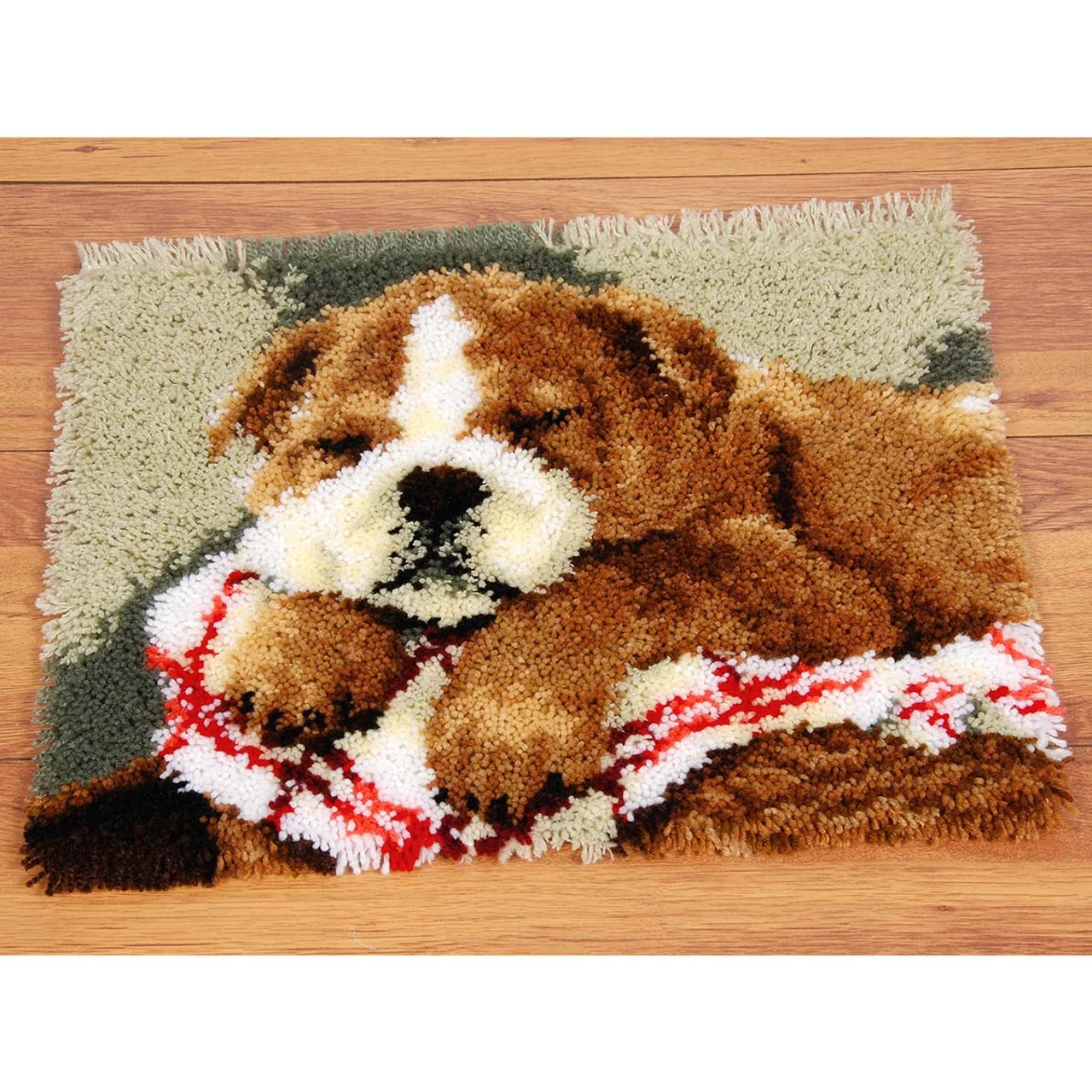 Spend a sleepy afternoon creating this adorable latch hook rug for the dog lover in your life. Latch hook can be enjoyed by crafters of all ages and skill levels. Finished projects can be made into pillows, wall hangings, rugs, and more! Kit includes 4.5-mesh hand-painted canvas, lofty pre-cut 100% acrylic yarn, latch hook tool, and instructions. The higher-gauge canvas of this project allows for a high level of detail in the finished design. 21 x 16″ (53 x 41cm). Imported.
